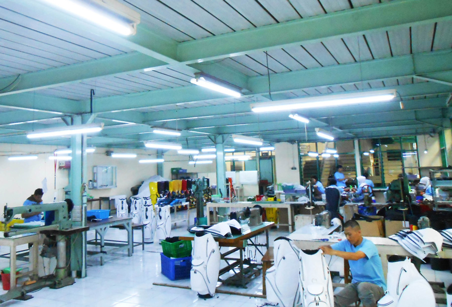 1999年の設立以来インドネシア バンドン市郊外のコポ地区にてゴルフバッグおよび、ゴルフバッグアクセサリーを生産しております。バンドンはジャカルタ国際空港より東へ約170㎞程にある盆地にある都市で、週末には首都ジャカルタの避暑地として多くの観光客も集まる大変賑わいのある都市です。街の中心部より車で15分ほどに位置する工場は、現在約150名ほどのスタッフで稼働しており、日本市場向けのゴルフバッグ、アクセサリーを中心に生産しております。生産を委託しているゴルフグローブ工場もバッグ工場より徒歩圏内にあり、バッグ、グローブの生産を一括して管理できる環境にあります。